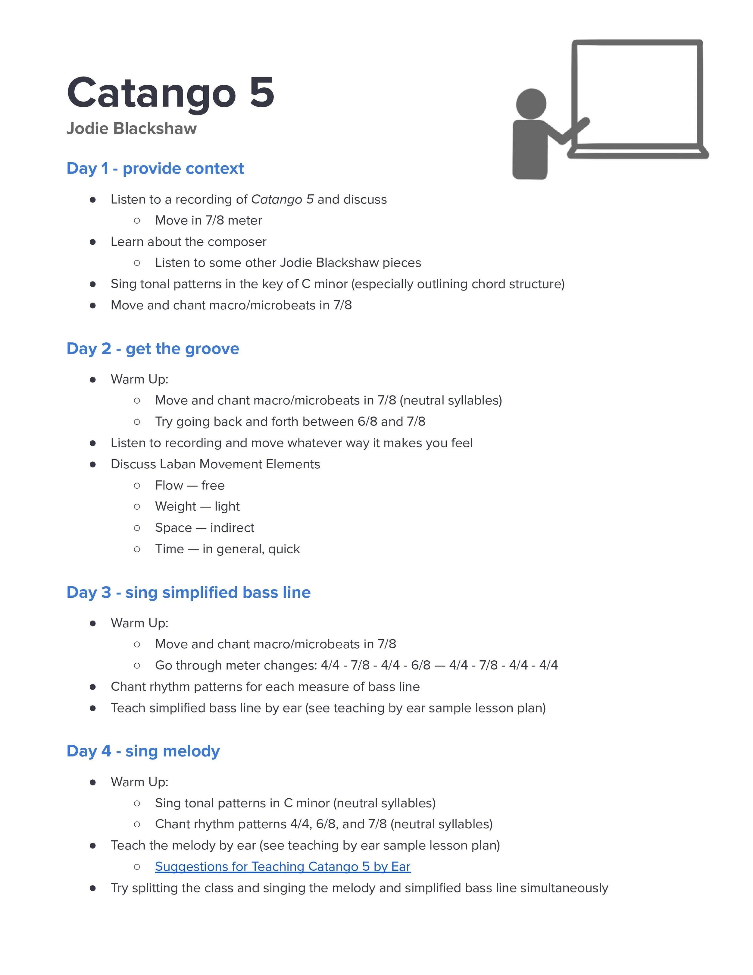 Teaching GuidesTemplates & Suggestions Planning Guide Guided questions to help you figure out what to teach Teaching Guide Suggested lesson plan structures and warm-up activities Establishing Tonalities What to sing/play to establish tonality in major, minor, dorian, phrygian, lydian, and mixolydian. Tips for Reluctant Singers How to get your students used to singing and suggestions for helping struggling singers Repertoire Sample Unit Plans